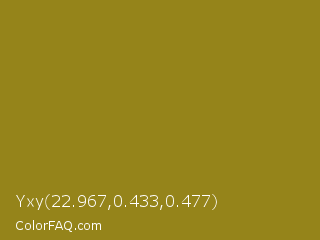 Yxy 22.967,0.433,0.477 Color is a normal yellow color and the nearest color is Hacienda #98811b. Hex code #95841a and RGB value is rgb(149,132,26). In RGB color space, this color is composed of 58% red, 52% green, 10% blue, In CMYK color space, this color is composed of 0% cyan, 11% magenta, 83% yellow , 42% black , In HSL color space, this color has a hue angle of 52° , 70% saturation and 34% lightness.