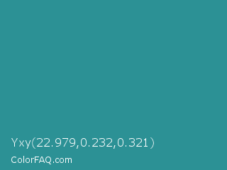 Yxy 22.979,0.232,0.321 Color is a normal cyan color and the nearest color is Lochinvar #2c8c84. Hex code #2c9195 and RGB value is rgb(44,145,149). In RGB color space, this color is composed of 17% red, 57% green, 58% blue, In CMYK color space, this color is composed of 70% cyan, 3% magenta, 0% yellow , 42% black , In HSL color space, this color has a hue angle of 182° , 54% saturation and 38% lightness.