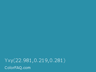 Yxy 22.981,0.219,0.281 Color is a normal cyan color and the nearest color is Eastern Blue #1e9ab0. Hex code #2a8fa9 and RGB value is rgb(42,143,169). In RGB color space, this color is composed of 16% red, 56% green, 66% blue, In CMYK color space, this color is composed of 75% cyan, 15% magenta, 0% yellow , 34% black , In HSL color space, this color has a hue angle of 192° , 60% saturation and 41% lightness.