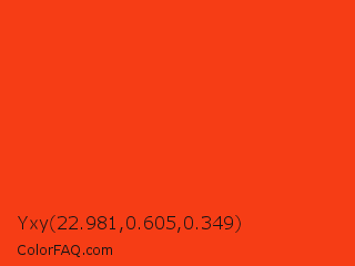 Yxy 22.981,0.605,0.349 Color is a normal red color and the nearest color is Pomegranate #f34723. Hex code #f63d15 and RGB value is rgb(246,61,21). In RGB color space, this color is composed of 96% red, 24% green, 8% blue, In CMYK color space, this color is composed of 0% cyan, 75% magenta, 91% yellow , 4% black , In HSL color space, this color has a hue angle of 11° , 93% saturation and 52% lightness.