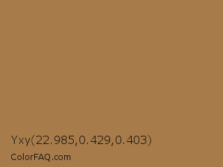 Yxy 22.985,0.429,0.403 Color is a normal orange color and the nearest color is Brown Sugar #af6e4d. Hex code #a87b4a and RGB value is rgb(168,123,74). In RGB color space, this color is composed of 66% red, 48% green, 29% blue, In CMYK color space, this color is composed of 0% cyan, 27% magenta, 56% yellow , 34% black , In HSL color space, this color has a hue angle of 31° , 39% saturation and 47% lightness.