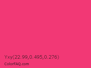Yxy 22.99,0.495,0.276 Color is a normal rose color and the nearest color is Cerise Pink #ec3b83. Hex code #f23875 and RGB value is rgb(242,56,117). In RGB color space, this color is composed of 95% red, 22% green, 46% blue, In CMYK color space, this color is composed of 0% cyan, 77% magenta, 52% yellow , 5% black , In HSL color space, this color has a hue angle of 340° , 88% saturation and 58% lightness.