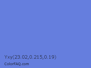 Yxy 23.02,0.215,0.19 Color is a light blue color and the nearest color is United Nations Blue #5b92e5. Hex code #657ede and RGB value is rgb(101,126,222). In RGB color space, this color is composed of 40% red, 49% green, 87% blue, In CMYK color space, this color is composed of 55% cyan, 43% magenta, 0% yellow , 13% black , In HSL color space, this color has a hue angle of 228° , 65% saturation and 63% lightness.