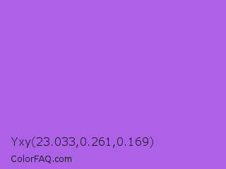 Yxy 23.033,0.261,0.169 Color is a light purple color and the nearest color is Rich Lilac #b666d2. Hex code #ac61e6 and RGB value is rgb(172,97,230). In RGB color space, this color is composed of 67% red, 38% green, 90% blue, In CMYK color space, this color is composed of 25% cyan, 58% magenta, 0% yellow , 10% black , In HSL color space, this color has a hue angle of 274° , 73% saturation and 64% lightness.