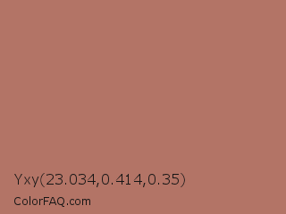 Yxy 23.034,0.414,0.35 Color is a normal red color and the nearest color is Copper Penny #ad6f69. Hex code #b37466 and RGB value is rgb(179,116,102). In RGB color space, this color is composed of 70% red, 45% green, 40% blue, In CMYK color space, this color is composed of 0% cyan, 35% magenta, 43% yellow , 30% black , In HSL color space, this color has a hue angle of 11° , 34% saturation and 55% lightness.