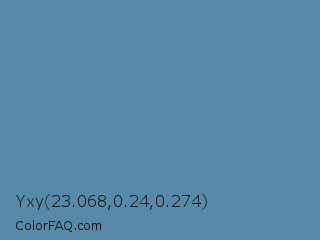 Yxy 23.068,0.24,0.274 Color is a normal blue color and the nearest color is Air Force Blue RAF #5d8aa8. Hex code #578aa9 and RGB value is rgb(87,138,169). In RGB color space, this color is composed of 34% red, 54% green, 66% blue, In CMYK color space, this color is composed of 49% cyan, 18% magenta, 0% yellow , 34% black , In HSL color space, this color has a hue angle of 203° , 32% saturation and 50% lightness.
