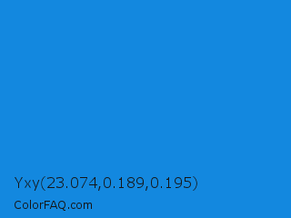 Yxy 23.074,0.189,0.195 Color is a normal blue color and the nearest color is Rich Electric Blue #0892d0. Hex code #1388df and RGB value is rgb(19,136,223). In RGB color space, this color is composed of 7% red, 53% green, 87% blue, In CMYK color space, this color is composed of 91% cyan, 39% magenta, 0% yellow , 13% black , In HSL color space, this color has a hue angle of 206° , 84% saturation and 47% lightness.