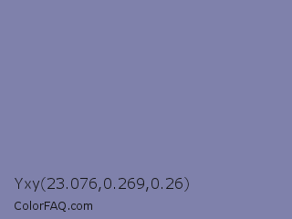 Yxy 23.076,0.269,0.26 Color is a normal blue color and the nearest color is Shadow Blue #778ba5. Hex code #7f81ab and RGB value is rgb(127,129,171). In RGB color space, this color is composed of 50% red, 51% green, 67% blue, In CMYK color space, this color is composed of 26% cyan, 25% magenta, 0% yellow , 33% black , In HSL color space, this color has a hue angle of 237° , 21% saturation and 58% lightness.