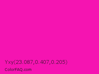 Yxy 23.087,0.407,0.205 Color is a normal magenta color and the nearest color is Shocking Pink #fc0fc0. Hex code #f514b1 and RGB value is rgb(245,20,177). In RGB color space, this color is composed of 96% red, 8% green, 69% blue, In CMYK color space, this color is composed of 0% cyan, 92% magenta, 28% yellow , 4% black , In HSL color space, this color has a hue angle of 318° , 92% saturation and 52% lightness.