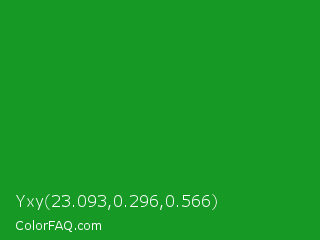 Yxy 23.093,0.296,0.566 Color is a normal green color and the nearest color is Forest Green #228b22. Hex code #179926 and RGB value is rgb(23,153,38). In RGB color space, this color is composed of 9% red, 60% green, 15% blue, In CMYK color space, this color is composed of 85% cyan, 0% magenta, 75% yellow , 40% black , In HSL color space, this color has a hue angle of 127° , 74% saturation and 35% lightness.