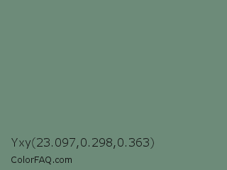 Yxy 23.097,0.298,0.363 Color is a normal green color and the nearest color is Viridian Green #678975. Hex code #6d8b79 and RGB value is rgb(109,139,121). In RGB color space, this color is composed of 43% red, 55% green, 47% blue, In CMYK color space, this color is composed of 22% cyan, 0% magenta, 13% yellow , 45% black , In HSL color space, this color has a hue angle of 144° , 12% saturation and 49% lightness.