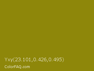 Yxy 23.101,0.426,0.495 Color is a dark yellow color and the nearest color is Dark Yellow #9b870c. Hex code #8e870a and RGB value is rgb(142,135,10). In RGB color space, this color is composed of 56% red, 53% green, 4% blue, In CMYK color space, this color is composed of 0% cyan, 5% magenta, 93% yellow , 44% black , In HSL color space, this color has a hue angle of 57° , 87% saturation and 30% lightness.