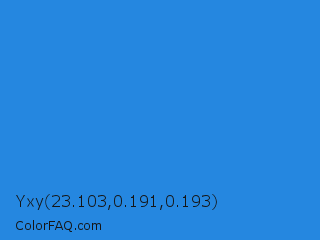 Yxy 23.103,0.191,0.193 Color is a normal blue color and the nearest color is Bleu De France #318ce7. Hex code #2587e0 and RGB value is rgb(37,135,224). In RGB color space, this color is composed of 15% red, 53% green, 88% blue, In CMYK color space, this color is composed of 83% cyan, 40% magenta, 0% yellow , 12% black , In HSL color space, this color has a hue angle of 209° , 75% saturation and 51% lightness.