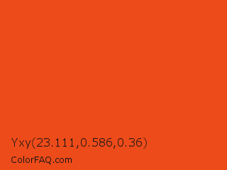 Yxy 23.111,0.586,0.36 Color is a normal red color and the nearest color is Pomegranate #f34723. Hex code #ed4b1a and RGB value is rgb(237,75,26). In RGB color space, this color is composed of 93% red, 29% green, 10% blue, In CMYK color space, this color is composed of 0% cyan, 68% magenta, 89% yellow , 7% black , In HSL color space, this color has a hue angle of 14° , 85% saturation and 52% lightness.