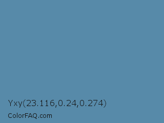Yxy 23.116,0.24,0.274 Color is a normal blue color and the nearest color is Air Force Blue RAF #5d8aa8. Hex code #578aa9 and RGB value is rgb(87,138,169). In RGB color space, this color is composed of 34% red, 54% green, 66% blue, In CMYK color space, this color is composed of 49% cyan, 18% magenta, 0% yellow , 34% black , In HSL color space, this color has a hue angle of 203° , 32% saturation and 50% lightness.