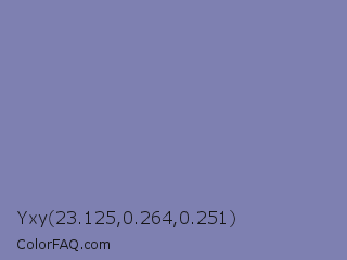 Yxy 23.125,0.264,0.251 Color is a normal blue color and the nearest color is Wild Blue Yonder #7a89b8. Hex code #7e80b1 and RGB value is rgb(126,128,177). In RGB color space, this color is composed of 49% red, 50% green, 69% blue, In CMYK color space, this color is composed of 29% cyan, 28% magenta, 0% yellow , 31% black , In HSL color space, this color has a hue angle of 238° , 25% saturation and 59% lightness.