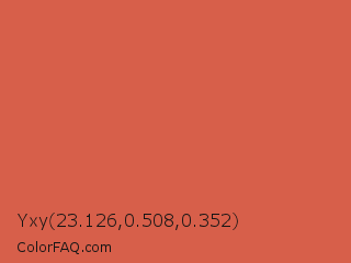 Yxy 23.126,0.508,0.352 Color is a normal red color and the nearest color is Jelly Bean #da614e. Hex code #d75f4a and RGB value is rgb(215,95,74). In RGB color space, this color is composed of 84% red, 37% green, 29% blue, In CMYK color space, this color is composed of 0% cyan, 56% magenta, 66% yellow , 16% black , In HSL color space, this color has a hue angle of 9° , 64% saturation and 57% lightness.