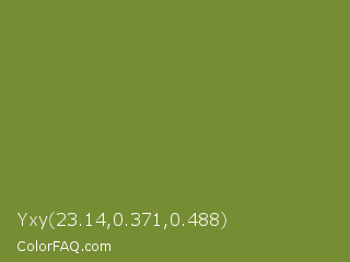 Yxy 23.14,0.371,0.488 Color is a normal lime color and the nearest color is Wasabi #788a25. Hex code #768d33 and RGB value is rgb(118,141,51). In RGB color space, this color is composed of 46% red, 55% green, 20% blue, In CMYK color space, this color is composed of 16% cyan, 0% magenta, 64% yellow , 45% black , In HSL color space, this color has a hue angle of 75° , 47% saturation and 38% lightness.