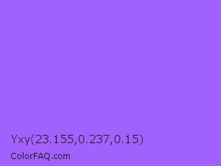 Yxy 23.155,0.237,0.15 Color is a light violet color and the nearest color is Navy Purple #9457eb. Hex code #a161fc and RGB value is rgb(161,97,252). In RGB color space, this color is composed of 63% red, 38% green, 99% blue, In CMYK color space, this color is composed of 36% cyan, 62% magenta, 0% yellow , 1% black , In HSL color space, this color has a hue angle of 265° , 96% saturation and 68% lightness.