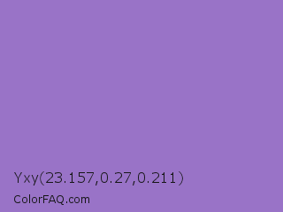 Yxy 23.157,0.27,0.211 Color is a light violet color and the nearest color is Lilac Bush #9874d3. Hex code #9973c7 and RGB value is rgb(153,115,199). In RGB color space, this color is composed of 60% red, 45% green, 78% blue, In CMYK color space, this color is composed of 23% cyan, 42% magenta, 0% yellow , 22% black , In HSL color space, this color has a hue angle of 267° , 43% saturation and 62% lightness.