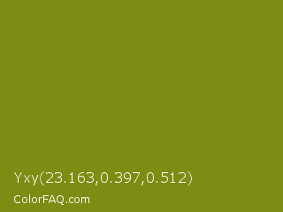 Yxy 23.163,0.397,0.512 Color is a normal yellow color and the nearest color is Trendy Green #7c881a. Hex code #7d8c12 and RGB value is rgb(125,140,18). In RGB color space, this color is composed of 49% red, 55% green, 7% blue, In CMYK color space, this color is composed of 11% cyan, 0% magenta, 87% yellow , 45% black , In HSL color space, this color has a hue angle of 67° , 77% saturation and 31% lightness.