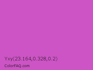 Yxy 23.164,0.328,0.2 Color is a normal magenta color and the nearest color is Fuchsia Pink #c154c1. Hex code #cc54c4 and RGB value is rgb(204,84,196). In RGB color space, this color is composed of 80% red, 33% green, 77% blue, In CMYK color space, this color is composed of 0% cyan, 59% magenta, 4% yellow , 20% black , In HSL color space, this color has a hue angle of 304° , 54% saturation and 56% lightness.