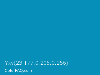 Yxy 23.177,0.205,0.256 Color is a normal blue color and the nearest color is Bondi Blue #0095b6. Hex code #068fb8 and RGB value is rgb(6,143,184). In RGB color space, this color is composed of 2% red, 56% green, 72% blue, In CMYK color space, this color is composed of 97% cyan, 22% magenta, 0% yellow , 28% black , In HSL color space, this color has a hue angle of 194° , 94% saturation and 37% lightness.