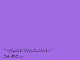 Yxy 23.178,0.253,0.174 Color is a light violet color and the nearest color is Medium Purple #9370db. Hex code #a169e4 and RGB value is rgb(161,105,228). In RGB color space, this color is composed of 63% red, 41% green, 89% blue, In CMYK color space, this color is composed of 29% cyan, 54% magenta, 0% yellow , 11% black , In HSL color space, this color has a hue angle of 267° , 69% saturation and 65% lightness.