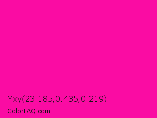 Yxy 23.185,0.435,0.219 Color is a normal magenta color and the nearest color is Hollywood Cerise #f400a1. Hex code #fa0ca3 and RGB value is rgb(250,12,163). In RGB color space, this color is composed of 98% red, 5% green, 64% blue, In CMYK color space, this color is composed of 0% cyan, 95% magenta, 35% yellow , 2% black , In HSL color space, this color has a hue angle of 322° , 96% saturation and 51% lightness.