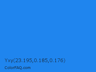 Yxy 23.195,0.185,0.176 Color is a normal blue color and the nearest color is Dodger Blue #1e90ff. Hex code #1f85ee and RGB value is rgb(31,133,238). In RGB color space, this color is composed of 12% red, 52% green, 93% blue, In CMYK color space, this color is composed of 87% cyan, 44% magenta, 0% yellow , 7% black , In HSL color space, this color has a hue angle of 210° , 86% saturation and 53% lightness.