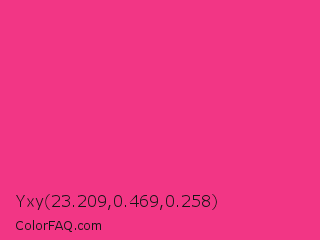 Yxy 23.209,0.469,0.258 Color is a normal rose color and the nearest color is Cerise Pink #ec3b83. Hex code #f23685 and RGB value is rgb(242,54,133). In RGB color space, this color is composed of 95% red, 21% green, 52% blue, In CMYK color space, this color is composed of 0% cyan, 78% magenta, 45% yellow , 5% black , In HSL color space, this color has a hue angle of 335° , 88% saturation and 58% lightness.