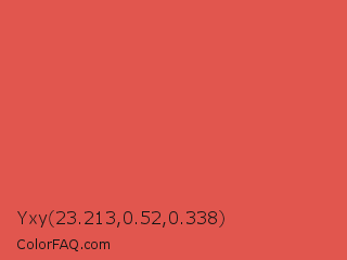 Yxy 23.213,0.52,0.338 Color is a normal red color and the nearest color is Jelly Bean #da614e. Hex code #e1564e and RGB value is rgb(225,86,78). In RGB color space, this color is composed of 88% red, 34% green, 31% blue, In CMYK color space, this color is composed of 0% cyan, 62% magenta, 65% yellow , 12% black , In HSL color space, this color has a hue angle of 3° , 71% saturation and 59% lightness.