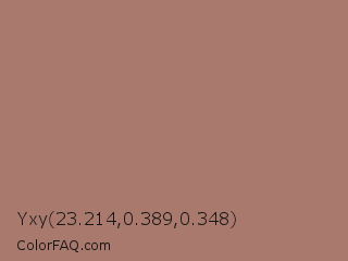 Yxy 23.214,0.389,0.348 Color is a normal red color and the nearest color is Burnished Brown #a17a74. Hex code #a9796d and RGB value is rgb(169,121,109). In RGB color space, this color is composed of 66% red, 47% green, 43% blue, In CMYK color space, this color is composed of 0% cyan, 28% magenta, 36% yellow , 34% black , In HSL color space, this color has a hue angle of 12° , 26% saturation and 55% lightness.