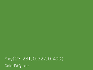 Yxy 23.231,0.327,0.499 Color is a normal green color and the nearest color is May Green #4c9141. Hex code #57933d and RGB value is rgb(87,147,61). In RGB color space, this color is composed of 34% red, 58% green, 24% blue, In CMYK color space, this color is composed of 41% cyan, 0% magenta, 59% yellow , 42% black , In HSL color space, this color has a hue angle of 102° , 41% saturation and 41% lightness.