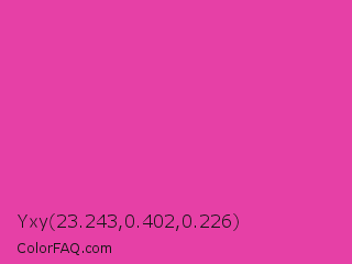 Yxy 23.243,0.402,0.226 Color is a normal magenta color and the nearest color is Frostbite #e936a7. Hex code #e640a6 and RGB value is rgb(230,64,166). In RGB color space, this color is composed of 90% red, 25% green, 65% blue, In CMYK color space, this color is composed of 0% cyan, 72% magenta, 28% yellow , 10% black , In HSL color space, this color has a hue angle of 323° , 77% saturation and 58% lightness.