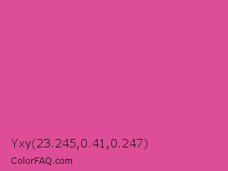 Yxy 23.245,0.41,0.247 Color is a normal rose color and the nearest color is Raspberry Pink #e25098. Hex code #de4e98 and RGB value is rgb(222,78,152). In RGB color space, this color is composed of 87% red, 31% green, 60% blue, In CMYK color space, this color is composed of 0% cyan, 65% magenta, 32% yellow , 13% black , In HSL color space, this color has a hue angle of 329° , 69% saturation and 59% lightness.