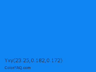 Yxy 23.25,0.182,0.172 Color is a normal blue color and the nearest color is Azure Radiance #007fff. Hex code #0e85f2 and RGB value is rgb(14,133,242). In RGB color space, this color is composed of 5% red, 52% green, 95% blue, In CMYK color space, this color is composed of 94% cyan, 45% magenta, 0% yellow , 5% black , In HSL color space, this color has a hue angle of 209° , 90% saturation and 50% lightness.