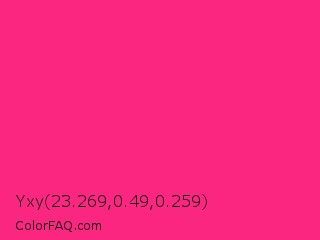 Yxy 23.269,0.49,0.259 Color is a normal rose color and the nearest color is Cerise Pink #ec3b83. Hex code #fa2680 and RGB value is rgb(250,38,128). In RGB color space, this color is composed of 98% red, 15% green, 50% blue, In CMYK color space, this color is composed of 0% cyan, 85% magenta, 49% yellow , 2% black , In HSL color space, this color has a hue angle of 335° , 95% saturation and 56% lightness.
