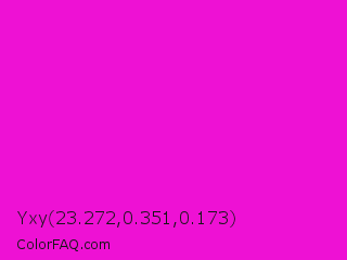 Yxy 23.272,0.351,0.173 Color is a normal magenta color and the nearest color is Hot Magenta #ff1dce. Hex code #ee11d4 and RGB value is rgb(238,17,212). In RGB color space, this color is composed of 93% red, 7% green, 83% blue, In CMYK color space, this color is composed of 0% cyan, 93% magenta, 11% yellow , 7% black , In HSL color space, this color has a hue angle of 307° , 87% saturation and 50% lightness.