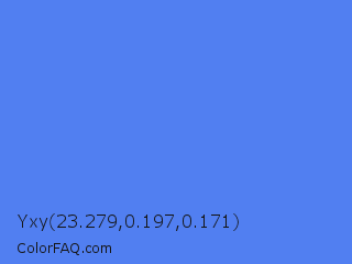 Yxy 23.279,0.197,0.171 Color is a light blue color and the nearest color is Blueberry #4f86f7. Hex code #517ff1 and RGB value is rgb(81,127,241). In RGB color space, this color is composed of 32% red, 50% green, 95% blue, In CMYK color space, this color is composed of 66% cyan, 47% magenta, 0% yellow , 5% black , In HSL color space, this color has a hue angle of 223° , 85% saturation and 63% lightness.