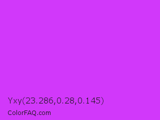 Yxy 23.286,0.28,0.145 Color is a normal purple color and the nearest color is Steel Pink #cc33cc. Hex code #d138fa and RGB value is rgb(209,56,250). In RGB color space, this color is composed of 82% red, 22% green, 98% blue, In CMYK color space, this color is composed of 16% cyan, 78% magenta, 0% yellow , 2% black , In HSL color space, this color has a hue angle of 287° , 95% saturation and 60% lightness.