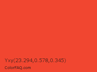 Yxy 23.294,0.578,0.345 Color is a normal red color and the nearest color is Pomegranate #f34723. Hex code #f14630 and RGB value is rgb(241,70,48). In RGB color space, this color is composed of 95% red, 27% green, 19% blue, In CMYK color space, this color is composed of 0% cyan, 71% magenta, 80% yellow , 5% black , In HSL color space, this color has a hue angle of 7° , 87% saturation and 57% lightness.