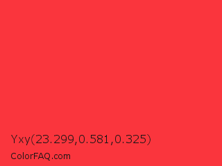 Yxy 23.299,0.581,0.325 Color is a normal red color and the nearest color is Coral Red #ff4040. Hex code #fa353d and RGB value is rgb(250,53,61). In RGB color space, this color is composed of 98% red, 21% green, 24% blue, In CMYK color space, this color is composed of 0% cyan, 79% magenta, 76% yellow , 2% black , In HSL color space, this color has a hue angle of 358° , 95% saturation and 59% lightness.
