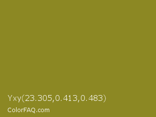 Yxy 23.305,0.413,0.483 Color is a normal yellow color and the nearest color is Hacienda #98811b. Hex code #8c8823 and RGB value is rgb(140,136,35). In RGB color space, this color is composed of 55% red, 53% green, 14% blue, In CMYK color space, this color is composed of 0% cyan, 3% magenta, 75% yellow , 45% black , In HSL color space, this color has a hue angle of 58° , 60% saturation and 34% lightness.