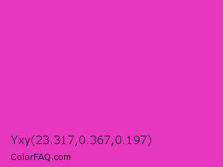 Yxy 23.317,0.367,0.197 Color is a normal magenta color and the nearest color is Frostbite #e936a7. Hex code #e637bf and RGB value is rgb(230,55,191). In RGB color space, this color is composed of 90% red, 22% green, 75% blue, In CMYK color space, this color is composed of 0% cyan, 76% magenta, 17% yellow , 10% black , In HSL color space, this color has a hue angle of 313° , 78% saturation and 56% lightness.