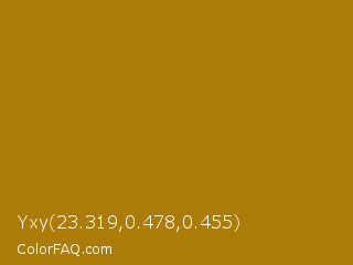 Yxy 23.319,0.478,0.455 Color is a normal orange color and the nearest color is Hot Toddy #b38007. Hex code #ad7c08 and RGB value is rgb(173,124,8). In RGB color space, this color is composed of 68% red, 49% green, 3% blue, In CMYK color space, this color is composed of 0% cyan, 28% magenta, 95% yellow , 32% black , In HSL color space, this color has a hue angle of 42° , 91% saturation and 35% lightness.