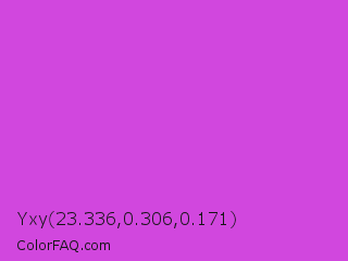 Yxy 23.336,0.306,0.171 Color is a normal magenta color and the nearest color is Steel Pink #cc33cc. Hex code #d147de and RGB value is rgb(209,71,222). In RGB color space, this color is composed of 82% red, 28% green, 87% blue, In CMYK color space, this color is composed of 6% cyan, 68% magenta, 0% yellow , 13% black , In HSL color space, this color has a hue angle of 295° , 70% saturation and 57% lightness.