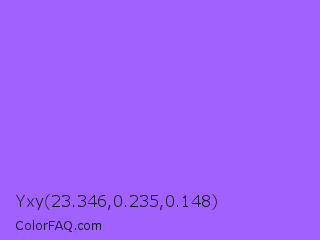 Yxy 23.346,0.235,0.148 Color is a light violet color and the nearest color is Navy Purple #9457eb. Hex code #a161ff and RGB value is rgb(161,97,255). In RGB color space, this color is composed of 63% red, 38% green, 100% blue, In CMYK color space, this color is composed of 37% cyan, 62% magenta, 0% yellow , 0% black , In HSL color space, this color has a hue angle of 264° , 100% saturation and 69% lightness.