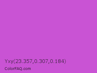 Yxy 23.357,0.307,0.184 Color is a normal magenta color and the nearest color is Medium Orchid #ba55d3. Hex code #c953d4 and RGB value is rgb(201,83,212). In RGB color space, this color is composed of 79% red, 33% green, 83% blue, In CMYK color space, this color is composed of 5% cyan, 61% magenta, 0% yellow , 17% black , In HSL color space, this color has a hue angle of 295° , 60% saturation and 58% lightness.