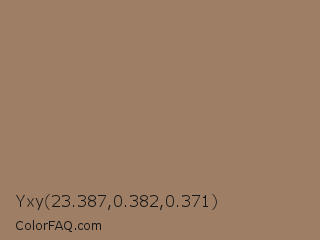 Yxy 23.387,0.382,0.371 Color is a normal orange color and the nearest color is Beaver #9f8170. Hex code #9e7f65 and RGB value is rgb(158,127,101). In RGB color space, this color is composed of 62% red, 50% green, 40% blue, In CMYK color space, this color is composed of 0% cyan, 20% magenta, 36% yellow , 38% black , In HSL color space, this color has a hue angle of 27° , 23% saturation and 51% lightness.